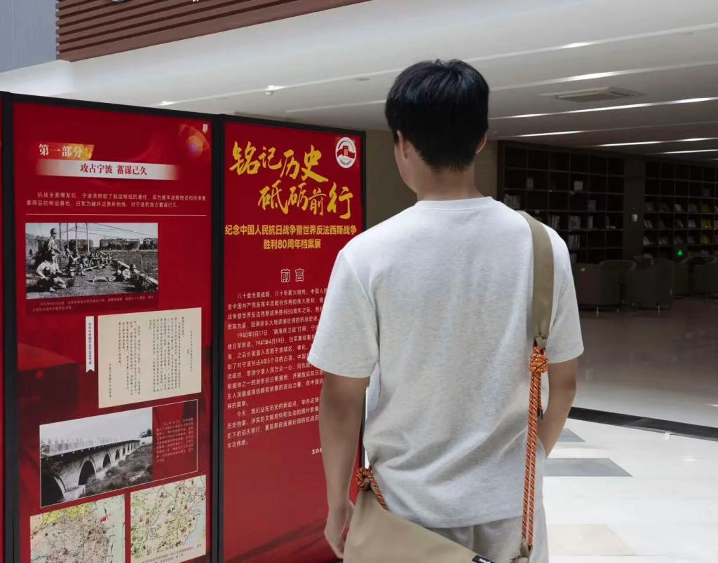 历史不会褪色,记忆更需传承。当同学们的目光掠过一件件承载着战火记忆的档案,感受一段段浸满血泪与荣光的历史,催人奋进。历史的回声从未消散,那些镌刻在甬城大地上的英雄史诗,依然通过一张张历史图片在浙药大青年学子的内心深处回响。